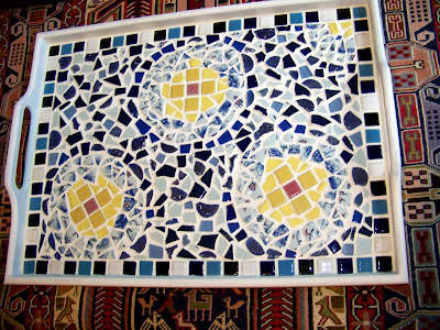 Days went by and the box remained. I just couldn’t bring myself to throw it away. I am a trash-to-treasure kind of girl. I kept thinking that the tea pot could be redeemed. I got busy dreaming up a project. Broken china screams mosaics, right? I had no experience with mosaics, but how hard could it be, amen? I decided to make a tray for serving our tea. I began breaking the china up into smaller pieces, and designing a bit of a pattern onto an old wooden tray that I had tucked away. It took many hours/days to complete, but finally it was done.I surprised her with it this morning. She loved it! It is now a treasure.